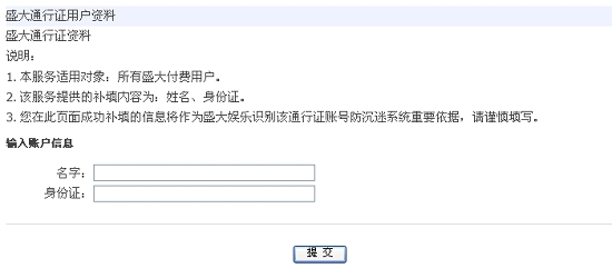 第二步:实名信息补填:请填写防沉迷认证,将自己的真实姓名和身份证号码添入下图的账户信息处。提交信息后,防沉迷资料补填成功。
